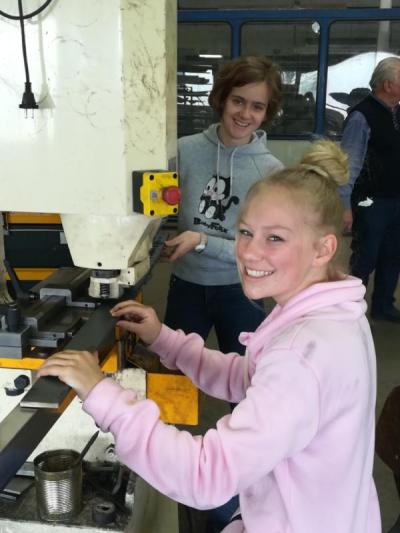 (Michelle-Janine Zimmermann und Joy Papist an der Stanzmaschine)