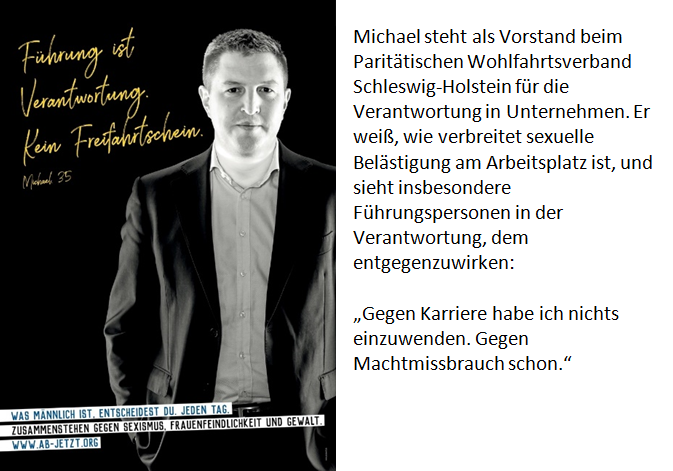 Einer dieser positiven Vorbilder ist Jens: Jens Ristedt ist immer wieder erschüttert davon, wie öffentlich sichtbare Frauen in digitalen Medien mit Vergewaltigungsandrohungen überhäuft werden: „Jeder von uns kennt diese Sprüche über Frauen aus dem eigenen Umfeld, sei es in den Sportumkleiden oder auch in den sozialen Medien. Wichtig ist mir, dass Männer reflektieren, welche Rolle sie sich selbst und Frauen damit zuschreiben. Gewalt ist nur das Ergebnis einer Kultur, die wir jetzt hinter uns lassen müssen.“