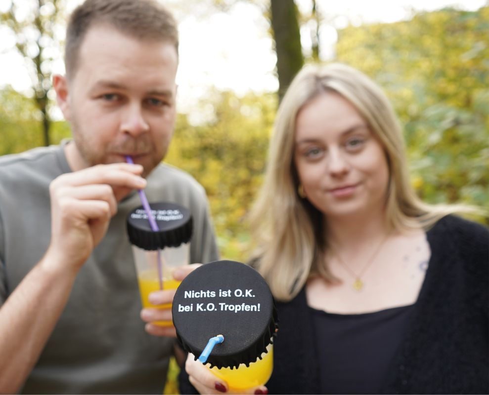 so Svenja Gruber. Der Getränkeschutz trägt den Slogan „Nichts ist O.K. bei K.O. Tropfen“ und ist gleichzeitig Haargummi, Schlüsselanhänger und Geldbörse.