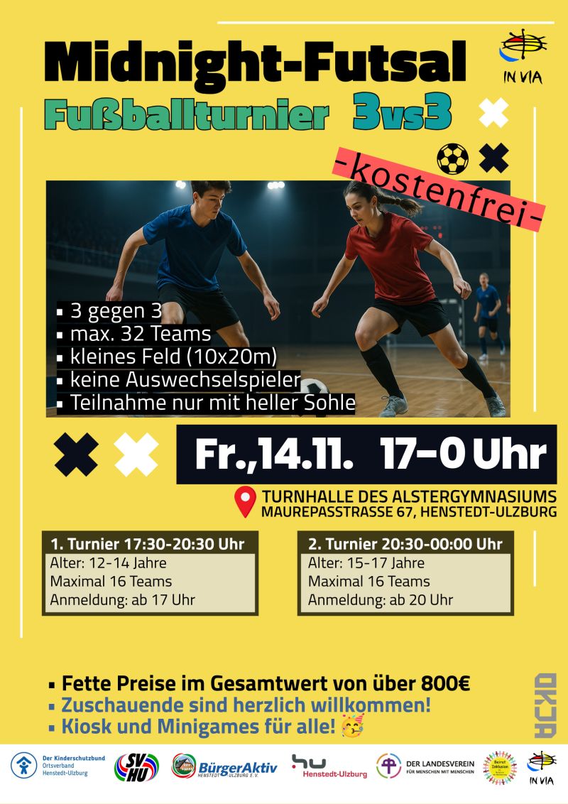 Am Freitag, 14. November, lädt der Arbeitskreis „Umfeldverbesserung“ des Rats für Kriminalitätsverhütung zum „Midnight-Futsal“-Turnier in die Sporthalle des Alstergymnasiums, Maurepasstraße 67, ein. Die Beteiligten freuen sich über zahlreiche Teilnehmende sowie Gäste. Von 17 bis 24 Uhr dreht sich alles um schnellen Hallenfußball, Fairplay und Teamgeist. Die Teams der Zwölf- bis 14-Jährigen treten von 17 bis 20.30 Uhr an, im Anschluss zeigen die 15- bis 17-Jährigen von 20.30 Uhr bis Mitternacht ihr Können. Wer mitspielen möchte, kommt einfach vorbei – die Anmeldung startet direkt zu Turnierbeginn in der Halle. Schnell sein lohnt sich: In jeder Altersklasse sind nur 16 Teams am Start!